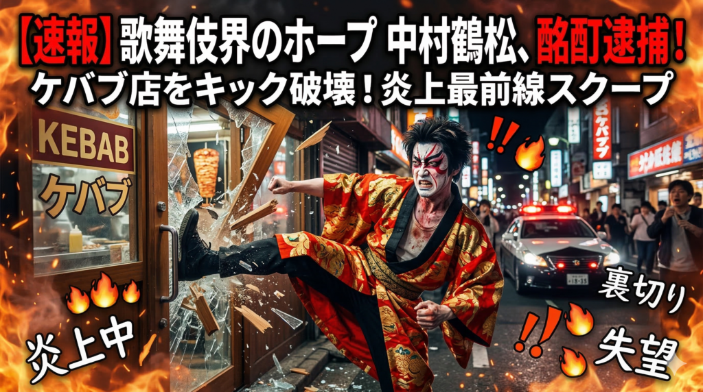 そう、歌舞伎俳優の中村鶴松(なかむら つるまつ)氏が、器物損壊の疑いで警視庁に現行犯逮捕されたんだ。容疑は、都内の飲食店、それもケバブ屋さんのドアを蹴って壊したっていうんだから、驚きだよね。