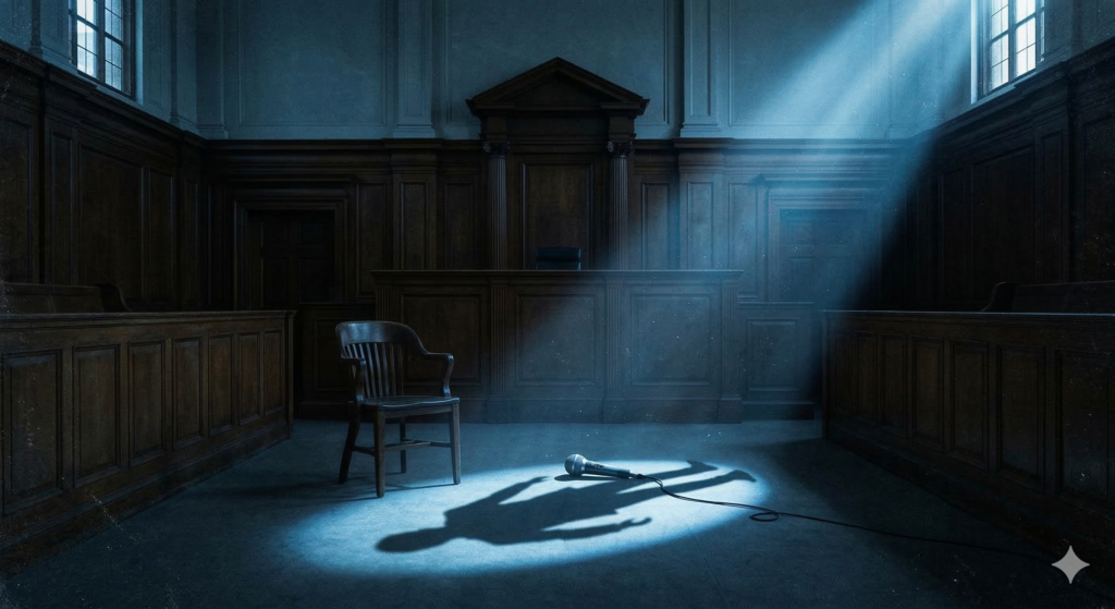 薄暗い法廷に、一筋の冷たい青い光が落ちている。床にある壊れたマイクは、かつての芸能界の栄光と失墜を象徴している。マイクが投げかける影が、崩れ落ちようとする男の姿に見える。