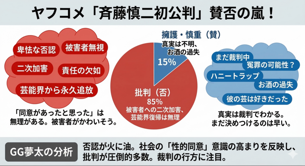 GGは、今回の斉藤被告の件は、本当に胸が痛むよ。かつてみんなを笑顔にしていた人が、なぜこんなことになってしまったのか。彼が法廷で放った「同意があった」という言葉。それが被害者の心をどれほど傷つけるか、想像もできない。