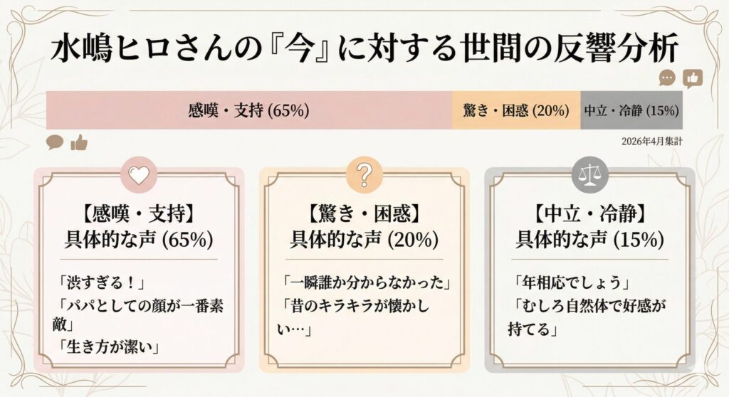 この一連の「再評価」の流れは、今後1ヶ月でさらに大きな社会現象へと発展するでしょう。 特に40代・50代の男性の間で、**「水嶋ヒロ流・ナチュラルエイジング」**が一大トレンドになると予測します。 「隠す美容」から「活かす美容」へ。 ゴールデンウィークに向けて、美容室では「グレーを活かした短髪」のオーダーが急増し、彼のライフスタイルを模範とする「余裕ある大人」のファッションが注目を集めることになるはずです。